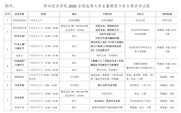 地点:网上“腾讯会议室”。会议室号和登录密码(见附件),7月7日前通知到每一位报名参加劳经学院夏令营活动的学生。责任人:何波老师。